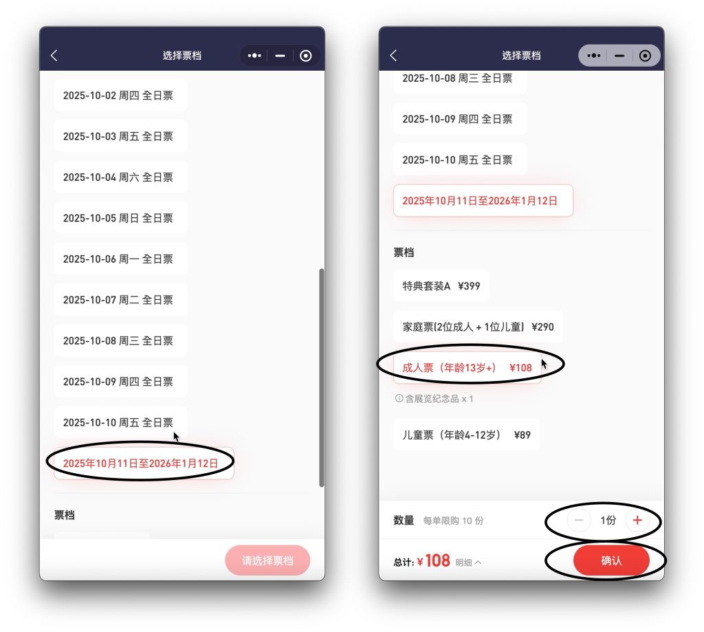 步驟三:點選您希望入場的場次(日子)及票檔,票檔必須為「成人票(年齡13-64歲)」,數量必須選1份。然後點選確認。