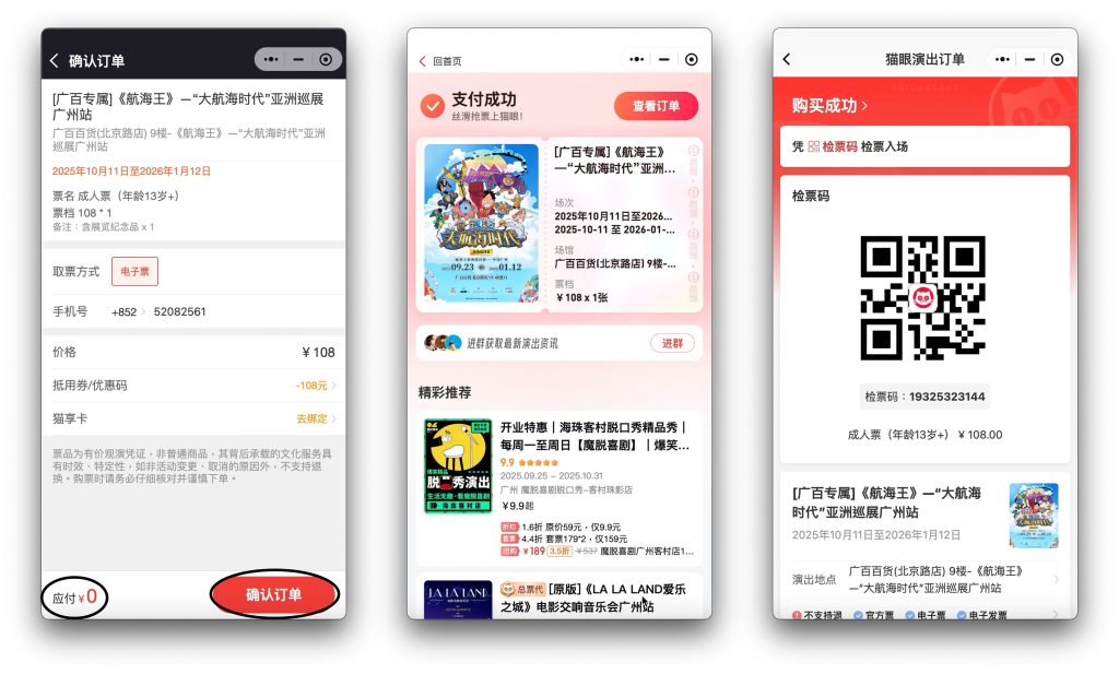 步驟五: 兌換碼生效後,確保結算金額為零。點選「確認付款」, 然後會出現付款成功頁面。點選「查看訂單」 ,入場二維碼就產生了。 請到廣百百貨 北京路店 9F展覽入口處出示此二維碼進場。